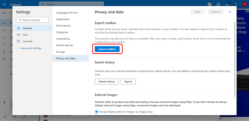 - Then, hit on the “General” setting >> “Privacy and Data” option to archive Outlook.com emails.