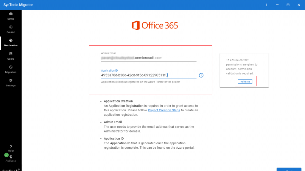 5. Login Office 365 destination tenant with Admin ID and Application ID, then click on the Validate button.