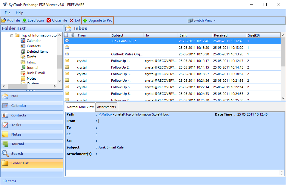 With the Free Exchange EDB Viewer Tool, deleted EDB data items can also be traced in the same manner. All the Exchange corrupted files can be traced and previewed. EDB Database Viewer allows a user to view and restore deleted items from Offline Exchange mailbox into multiple file formats.